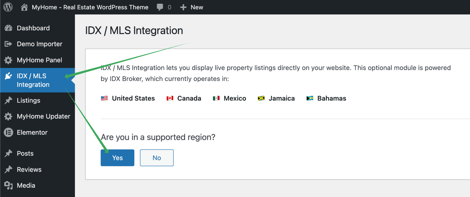 1. Go to IDX / MLS Integration in your WordPress admin. On first visit, confirm you are in a supported region (one-time check).