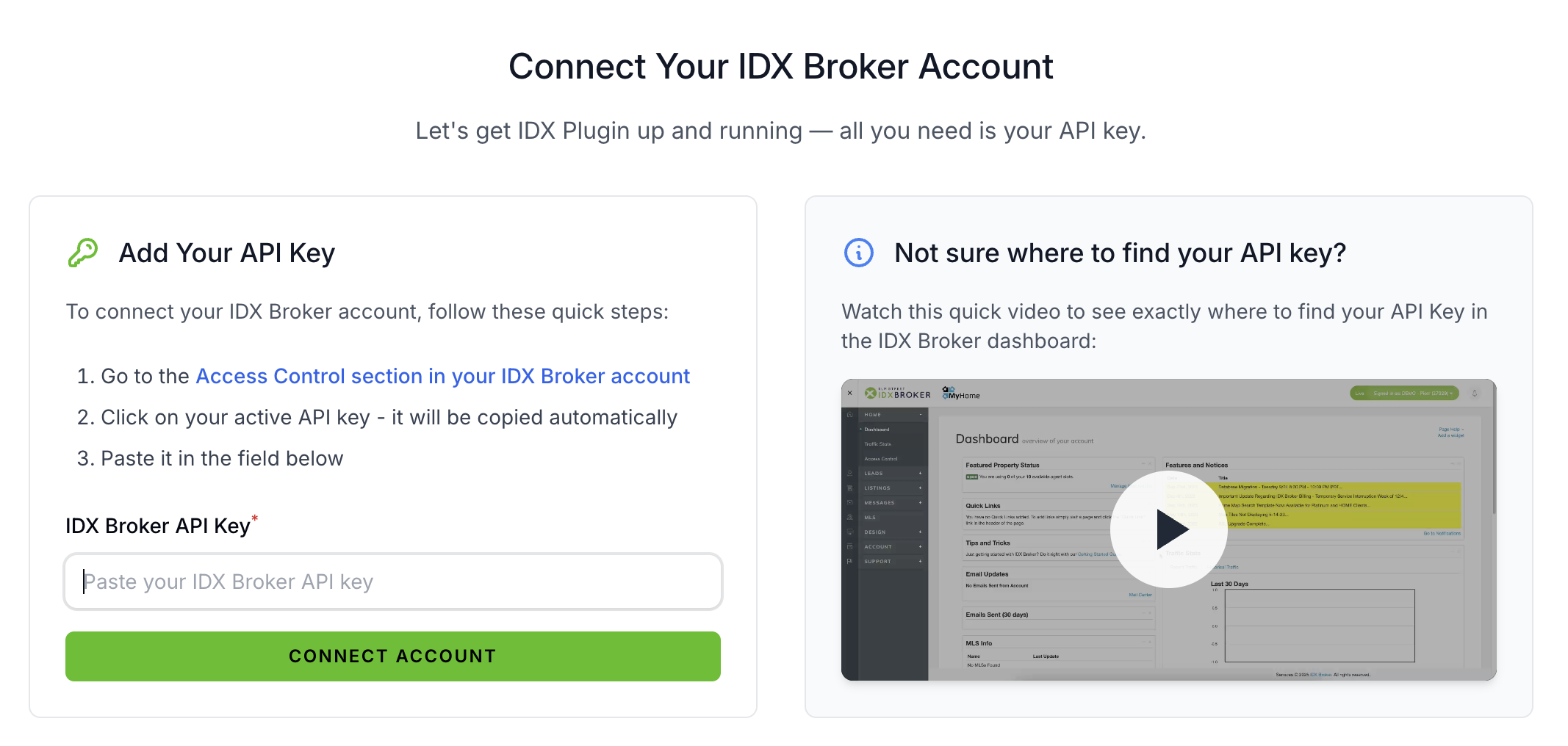 a) IDX Broker API key not added yet: You will be asked to enter your IDX Broker API key. Follow the on-screen instructions to find it in your IDX Broker account.