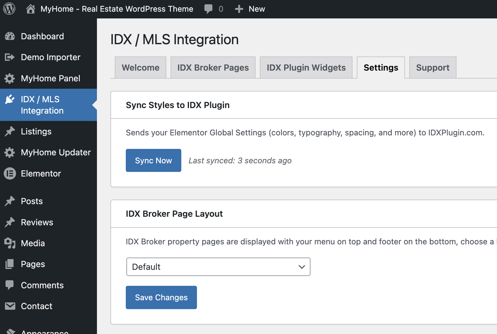 Sync Styles to IDX Plugin - sends your Elementor Global Settings (colors, typography, spacing) to IDX Plugin so your IDX pages match your design. Click Sync Now after making changes.