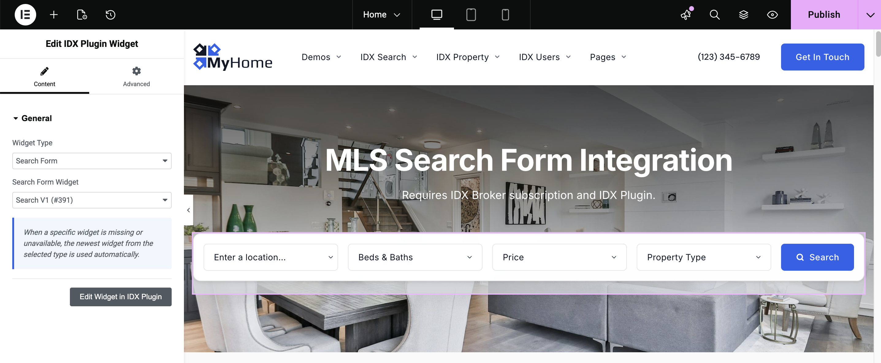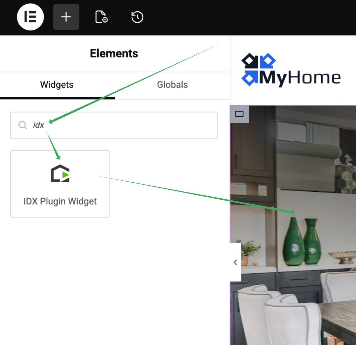 IDX Plugin adds a single Elementor widget that lets you place any IDX Plugin widget on your page - search forms (horizontal, vertical, simple), AI-powered search, listing showcases, and listing carousels. To add one: