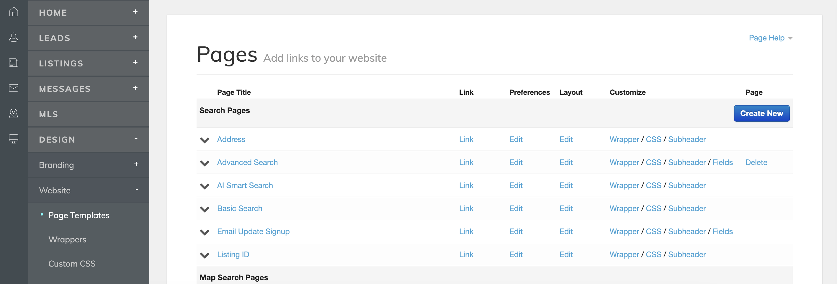 8. Manually repeat the process for the other pages. Go back to middleware.idxbroker.com/mgmt/pages and edit the layout of Basic Search, set the recommended template, then move to the next page, and so on.