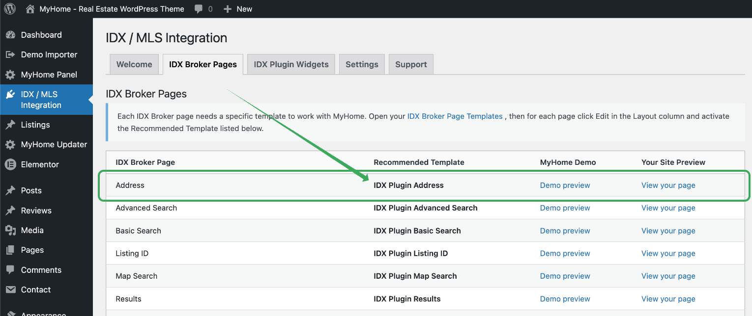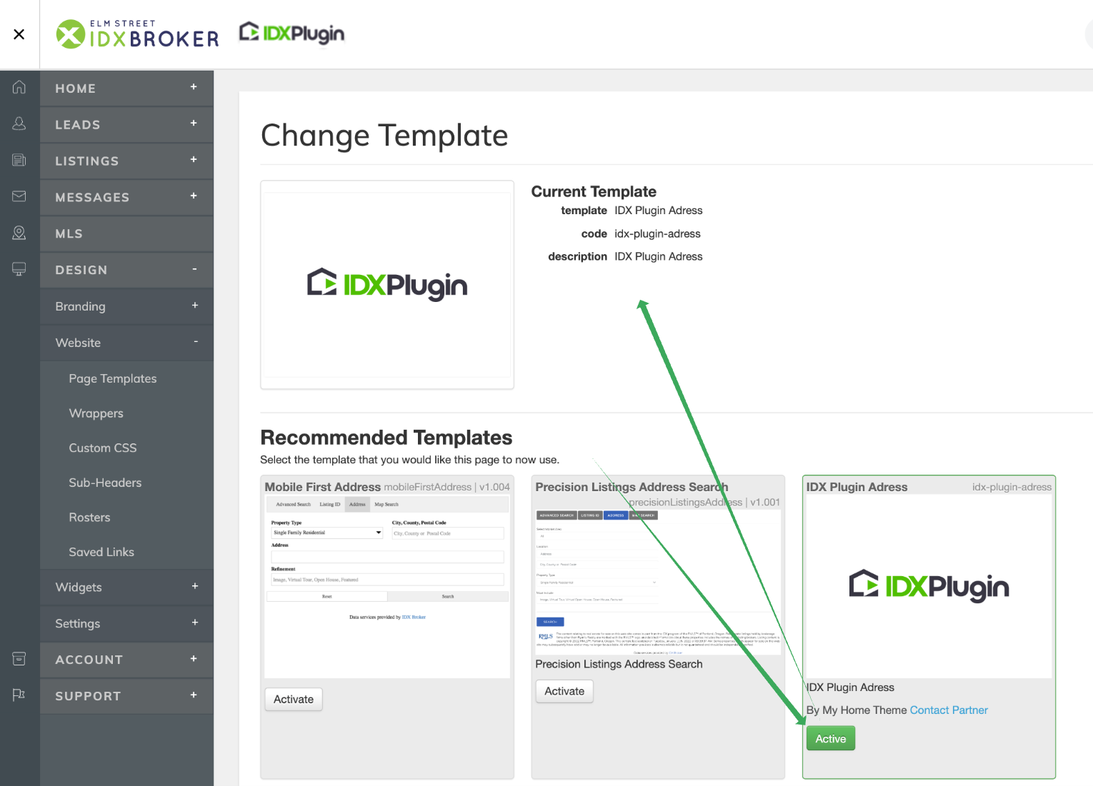 5. Check the recommended template in MyHome. Here it is "IDX Plugin Address".